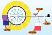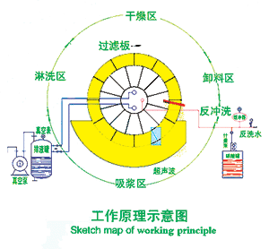 吸漿區:工作時浸沒在料漿的過濾板在毛細作用下結合真空壓力,表面吸附成一層濾餅,濾液通過濾板進分配閥至排液罐。